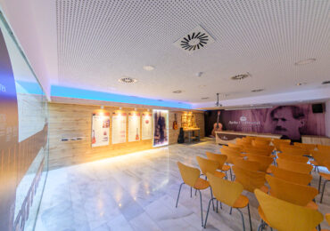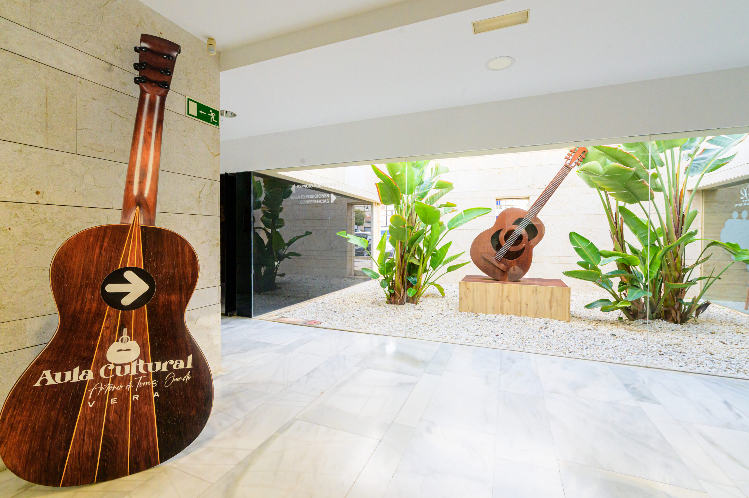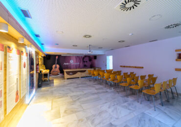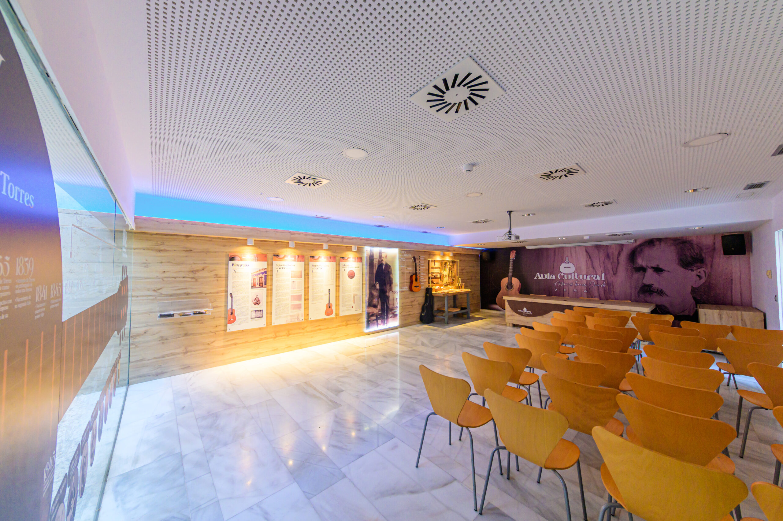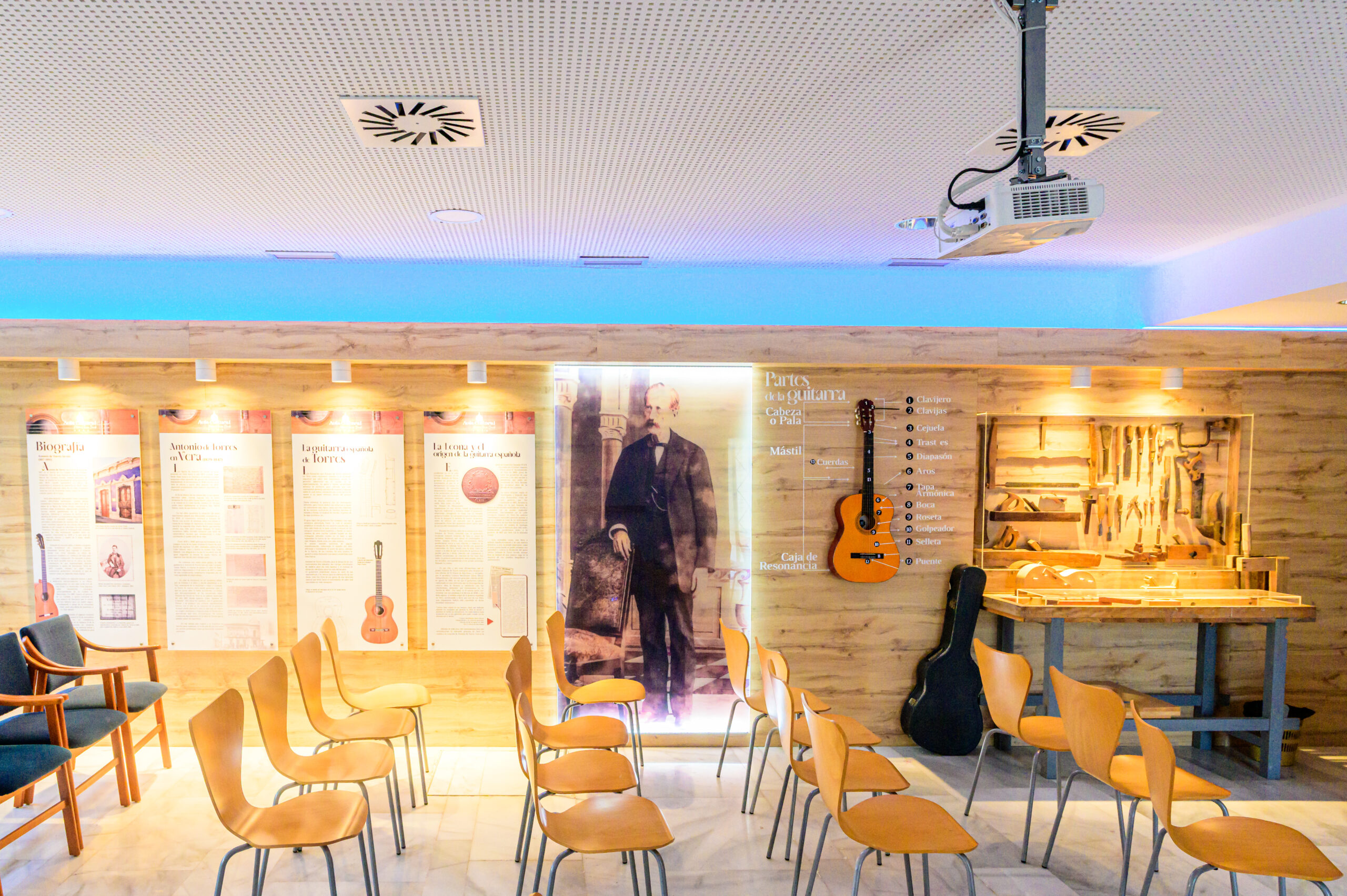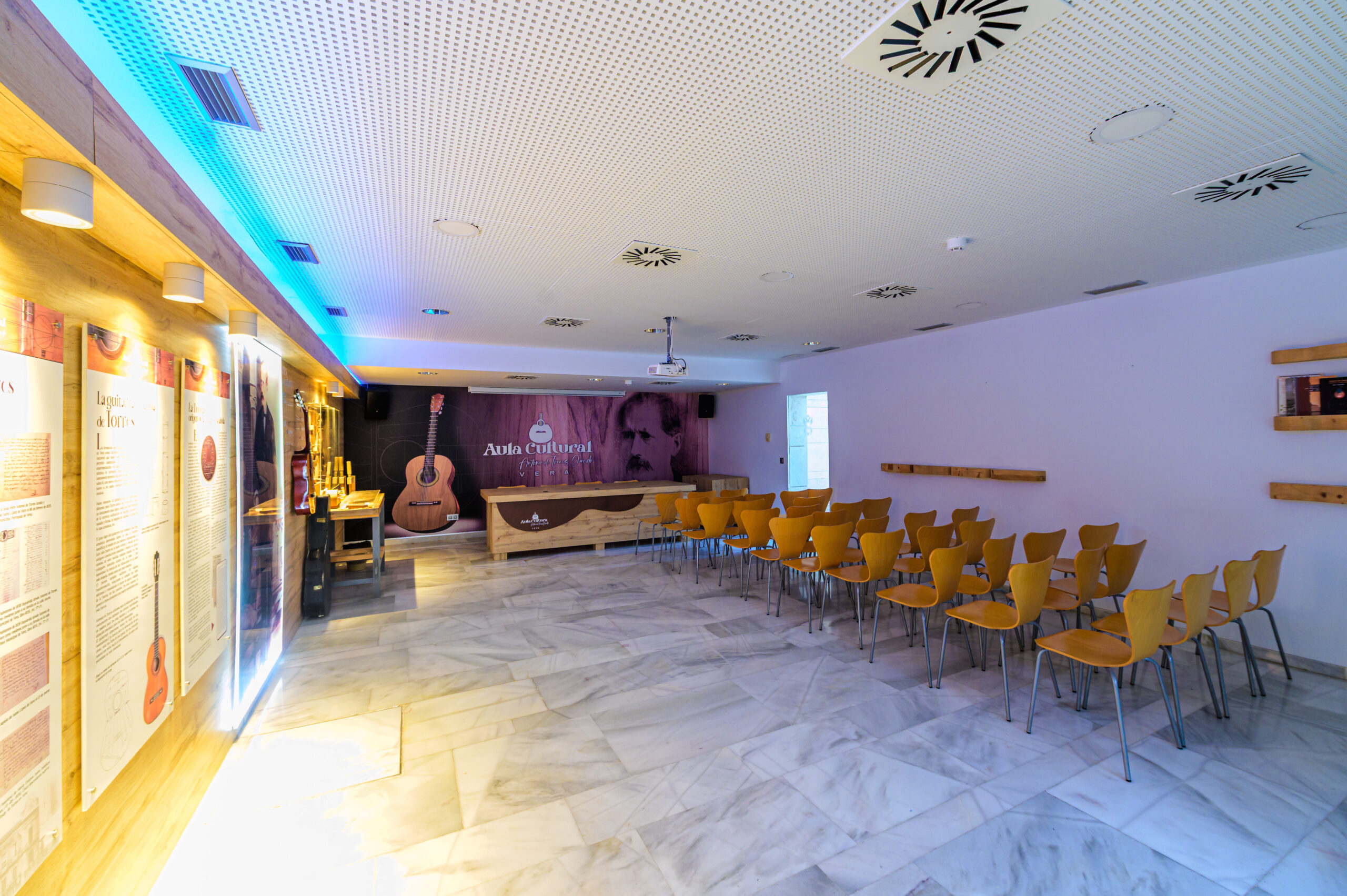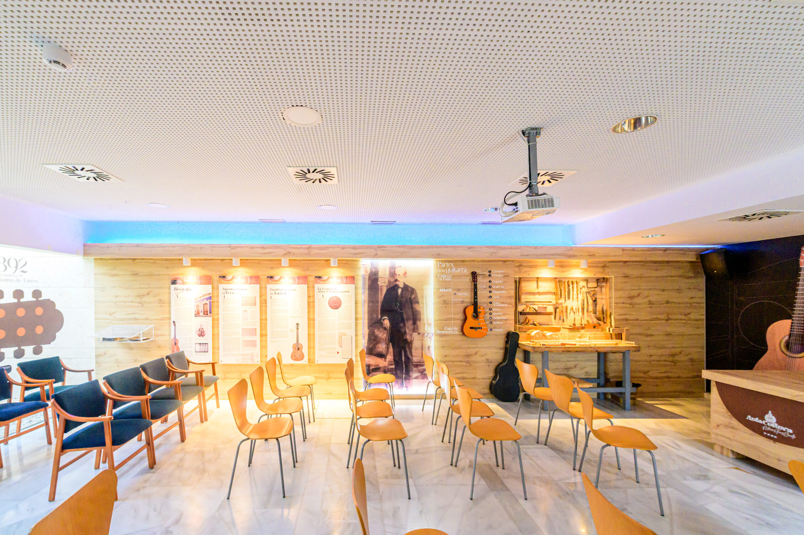 Sala cultural con capacidad para 40 personas, equipada con mesa presidencial, sistema de microfonía y altavoces, así como proyector y pantalla para presentaciones. El espacio se complementa con información biográfica del luthier Antonio de Torres, ofreciendo un entorno ideal para charlas, conferencias y actividades culturales.